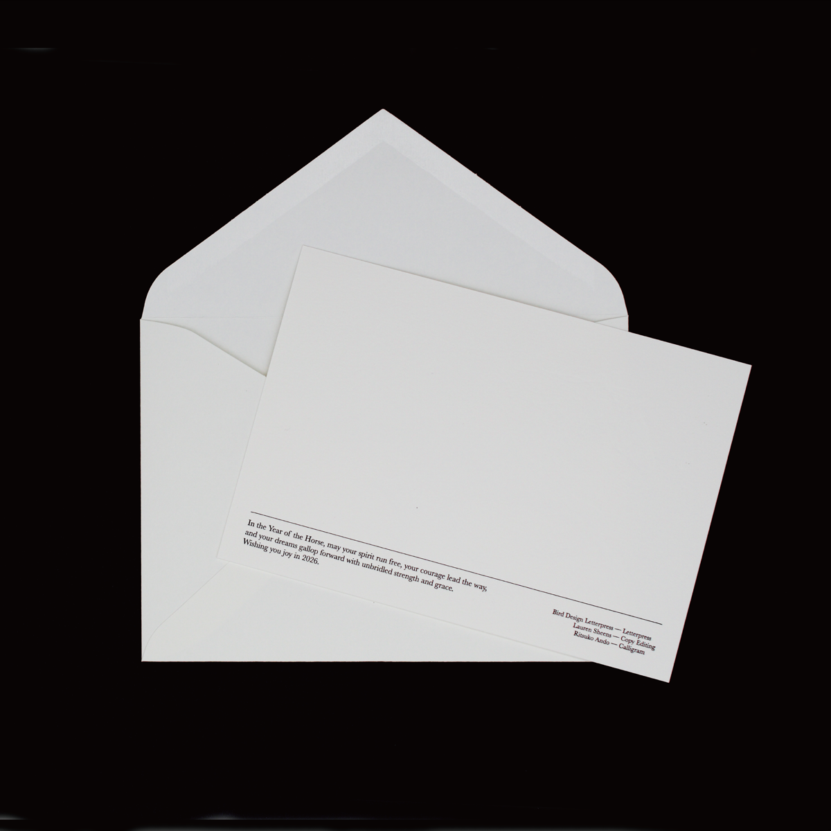 | 箔押し活版年賀状2026/HORSE 封筒付き 用紙: スノーブル-FS 273kg(約0.45mm厚) サイズ: 108mm×154mm |